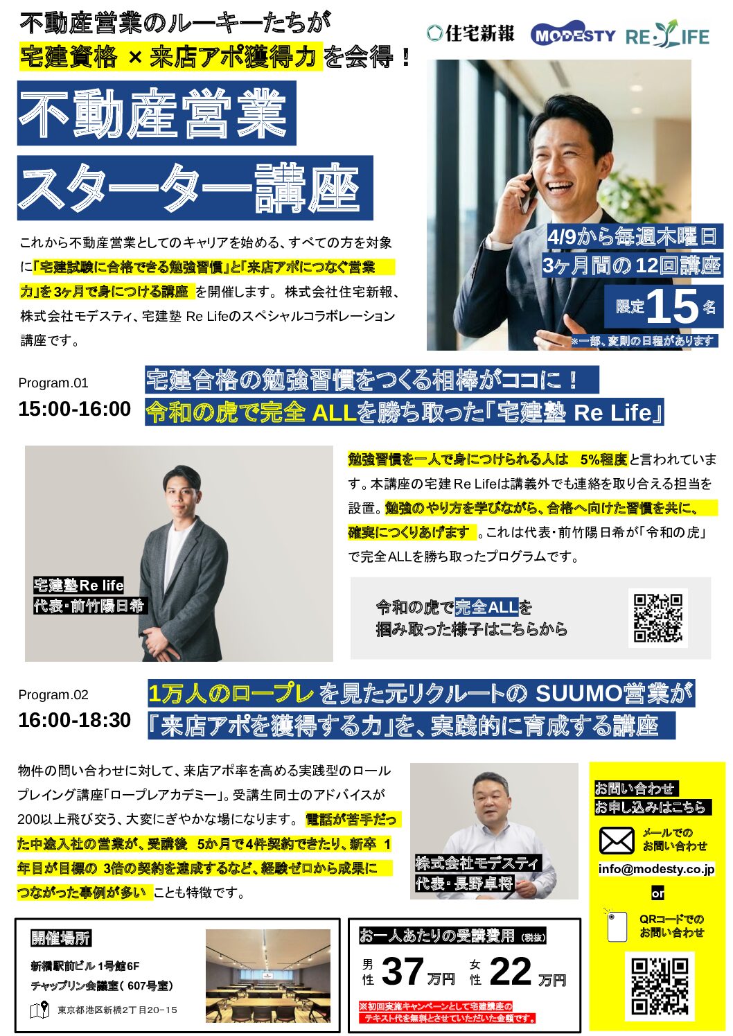 4月 不動産営業 スターター講座 「ロープレアカデミー」×「宅建塾Re Life」開講のお知らせ これから不動産営業としてのキャリアを始める、すべての方を対象に「宅建試験に合格できる勉強習慣」と「来店アポにつなぐ営業力」を3ヶ月で身につける講座を開催します。 ...